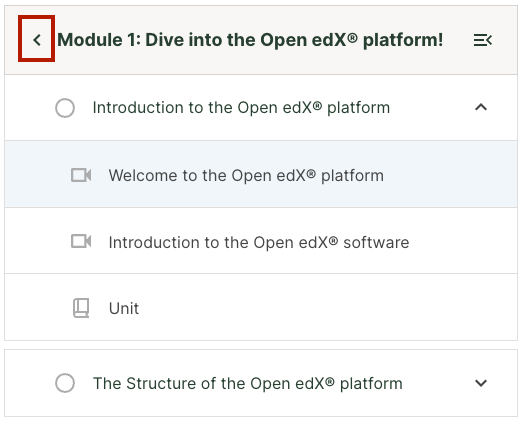 If a learner wants to view a unit in another section of the course, they can click on the back button in the upper corner of the sidebar to view all sections in a course.