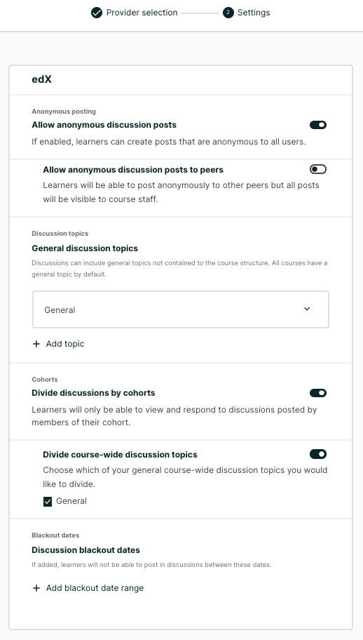 2. Toggle the Allow anonymous discussion posts to peers to enable learners to make posts that are anonymous to everyone other learners.