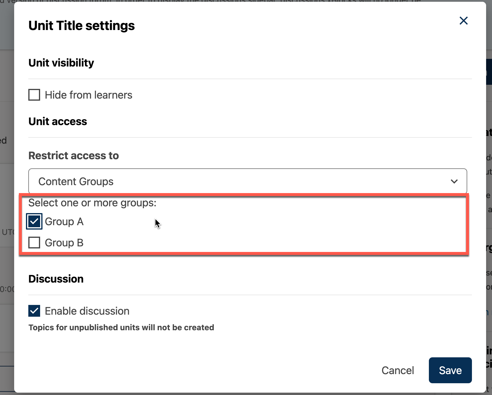 If you have more than one enrollment track in your course, or if you have enabled cohorts, you can limit a unit’s availability to specific groups of learners. For information about offering different content to different learner groups, see Offering Different Content to Different Learner Groups.