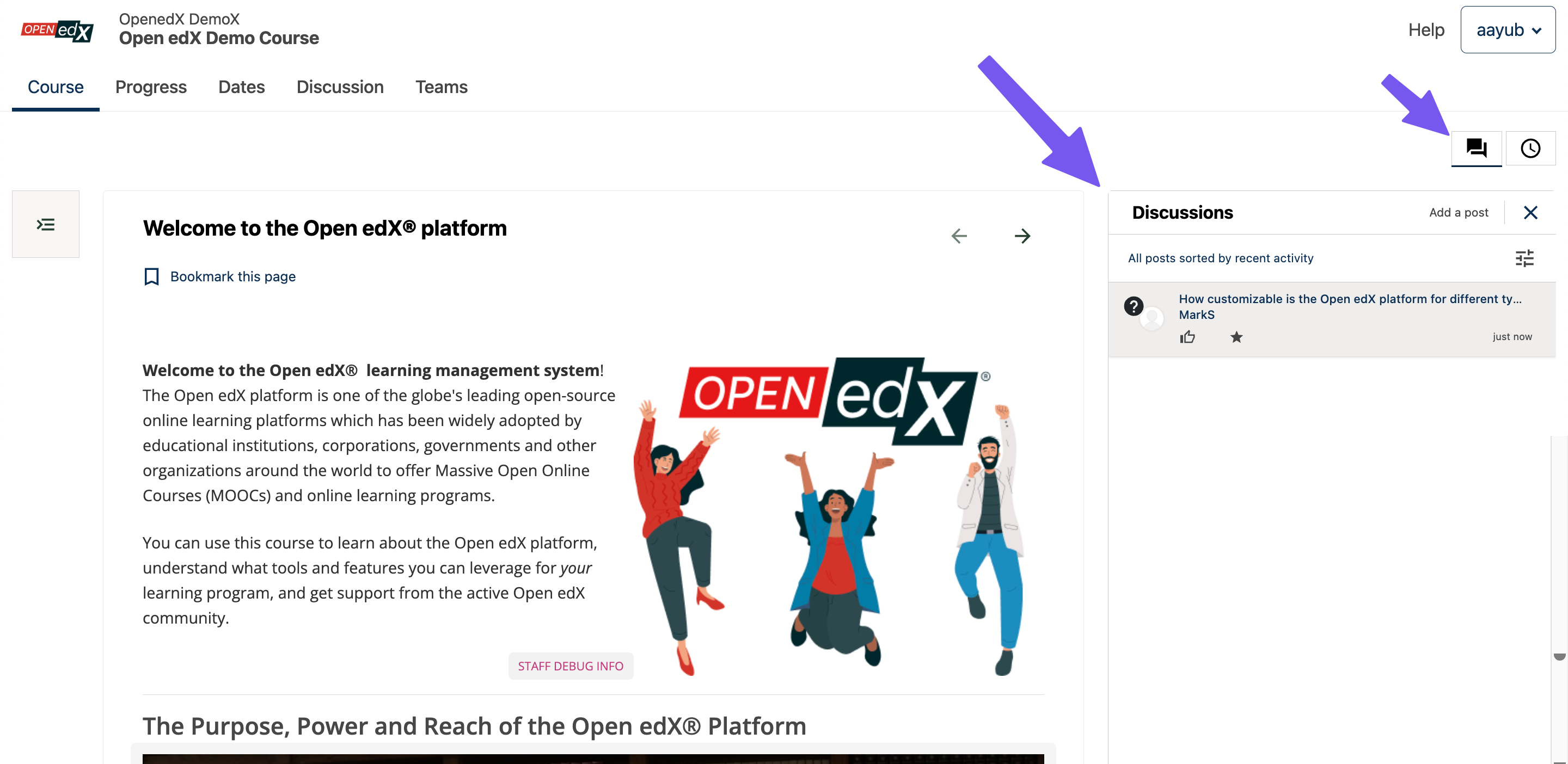 Some course units include a discussion panel on the right side of the page. You can use this panel to read or take part in discussions related specifically to that unit.